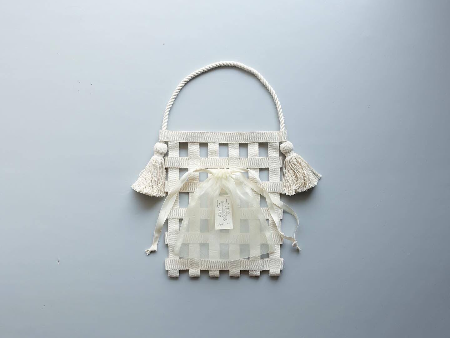こちらのバッグにぴったりサイズでお作りしたインナーバッグならぬインナー巾着や、バッグ自体の透け感を活かしたシルクオーガンジーの巾着など、単体でも使いやすいサイズ感のベーシックでシンプルな巾着もぜひ一緒にご覧ください。